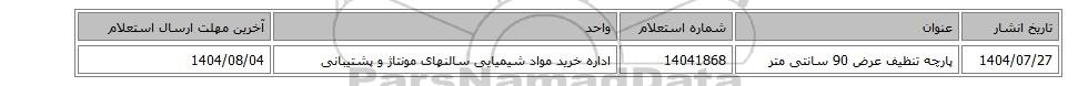 | 1404/07/27 | پارچه تنظیف عرض 90 سانتی متر | 14041868 | اداره خرید مواد شیمیایی سالنهای مونتاژ و پشتیبانی | 1404/08/04 |