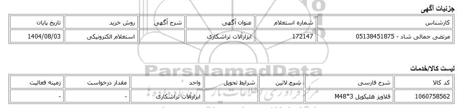 | مرتضی جمالی شاد - 05138451875 | 172147 | ابزارآلات تراشکاری | استعلام الکترونیکی | 1404/08/03 |