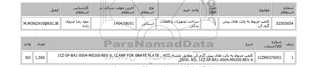 | 52505054 | کلمپ مربوط به پالت های پیش گرم کن | 1 | ساخت تجهیزات و قطعات یدکی | استانی | 1404/08/01 | محمد رضا منزوی زاده | M.MONZAVI@KSC.IR |