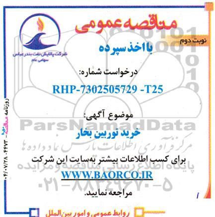 مناقصه خرید توربین بخار- نوبت دوم از کلیه افراد متخصص و شرکتها واجد شرایط دعوت به عمل میآید در مناقصه با کد خبرگزاری پارس نماد: 9722509 شرکت نمایند.