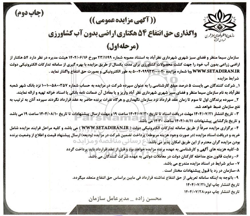 سازمان سیما منظر و فضای سبز شهری شهرداری نظرآباد به استناد مصوبه شماره 1199/23 مورخ 1404.6.16 هیئت مدیره در نظر دارد 54 هکتار از اراضی زراعی بدون آب خود را جهت کشت محصولات کشاورزی برای مدت یک سال از طریق مزایده یا بهره گیری از سامانه تدارکات الکترونیکی دولت ستاد ایران و با شماره مزایده 5004099933000020 به طور الکترونیکی به صورت حق انتفاع واگذار نماید.