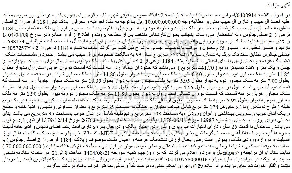 در اجرای کلاسه 0400914/اجرایی حسب اجرائیه واصله از شعبه 2 دادگاه عمومی حقوقی شهرستان چالوس رای داوری له صفر علی پور عروس محله علیه احمد آل حبیب و نازی آل حبیب مبنی بر مطالبه وجه 10.000.000.000 ریال با توجه به مفاد اجرائیه و معرفی پلاک ثبتی 1184 فرعی از 2 اصلی متعلق به خانم نازی آل حبیب کارشناس منتخب از ملک بازدید و نظریه خود را به شرح ذیل اعلام نموده است :مبنی بر ارزیابی ملک به شماره ثبتی 1184 فرعی از 2 اصلی چالوس ، به استحضار می رساند اینجانب بعنوان کارشناس منتخب پس از مطالعه پرونده و اطلاع از قرار صادره در مورخ 1404/04/08 در معیت و هدایت مالک از مورد ارزیابی واقع در چالوس خیابان عاشورا خیابان جنت انتهای کوچه ایده آل با مختصات جغرافیایی 538434 =x و 4057257 =y ، بازدید و ضمن تحقیق ، بررسیهای لازم معمول و مراتب با توصیف اجمالی به شرح ذیل تقدیم می گردد :ملک به شماره 1184 فرعی از 2 اصلی چالوس مطابق سند تک برگ به شماره سریال 768640 سری ج سال 93 به مالکیت خانم نازی آل حبیب می باشد . حدود و مشخصات ملک : ششدانگ عرصه و اعیان زمین با بنای احداثی به شماره پلاک 1184 فرعی از 2 اصلی بخش یک ثبت ملک چالوس استان مازندران به مساحت چهارصد و چهل و یک متر و هفتاد دسیمتر مربع ( 441.70 مترمربع ) می باشد که حدود آن شمالاً : در سه قسمت که قسمت دوم آن غربی است. اول بدیوار بطول 11.85 متر به ملک مجاور دوم به دیوار بطول 0.40 متر به ملک مجاور سوم به دیوار بطول 11.80 متر به ملک مجاور شرقاً : در سه قسمت اول به دیوار بطول 7.00 متر به ملک مجاور دوم به دیوار بطول 5.95 متر به ملک مجاور سوم به دیوار بطول 10.35 متر به ملک مجاور جنوباً : در سه قسمت که قسمت دوم آن غربی است . اول درب و دیوار بطول 4.65 متر به کوچه دوم دیواریست بطول 6.20 متر به ملک مجاور سوم دیواریست بطول 19.20 متر به ملک مجاور غرباً : در سه قسمت که قسمت دوم آن شمالی است . اول به دیوار بطول 11.80 متر به ملک مجاور دوم به دیوار بطول 1.90 متر به ملک مجاور سوم به دیوار بطول 5.95 متر به ملک مجاور . حقوق ارتفاقی ملک ندارد . در سطح عرصه یکدستگاه ساختمان مسکونی سه خوابه در یک ونیم طبقه ( طرح دوبلکس ) با زیربنای کل 178 مترمربع شامل همکف بعنوان پارکینگ به مساحت 35 مترمربع و بعنوان مسکونی ( نشیمن و آشپزخانه و مطبخ و یک اتاق خوب و سرویس بهداشتی و ایوان ورودی ) به مساحت 108 مترمربع و نیم طبقه شامل دو اتاق خواب بمساحت 35 مترمربع می باشد .بنای احداثی دارای پروانه ساختمان به شماره 12987 مورخ 1378/06/11 وگواهی پایان ساختمان به شماره 26763 مورخ 1379/12/14 از شهرداری چالوس می باشد . ساختمان با قدمت 25 سال ، دارای امتیازات آب ، برق و گاز ، در اختیار مالک و در حال بهره برداری است .کف فضای نشیمن و آشپزخانه لمینت ، کف اتاق خوابها و مطبخ سنگ ، کابینت ها از نوع mdf ، پنجره ها آلومینیوم با حفاظ آهنی ، سیستم گرمایشی بخاری گازی و شومینه و سرمایشی کولر اسپلیت و دروازه ورودی ملک ریموتی است .علی ایحال ارزش ششدانگ عرصه و اعیان ملک موصوف ( پلاک 1184 فرعی از 2 اصلی چالوس ) با عنایت به موقعیت مکانی ، شرایط زمانی ، قدمت و کیفیت بنای احداثی و سایر عوامل موثر در ارزیابی جمعاً به مبلغ کل هفتاد میلیارد ( 70.000.000.000 ) ریال برآورد و اعلام می گردد .که در روزچهارشنبه مورخه 1404/08/21 ساعت 8 الی21 در سامانه ستاد به نشانی سایت ستاد ایران مراجعه و نسبت به شرکت در مزایده با شماره حراج 3004107580000167 اقدام نمایند ، مزایده از قیمت ارزیابی شده شروع وبه کسانیکه بالاترین قیمت را خریدار باشند واگذار خواهد شد بهای مزایده برابر ماده 129ق اجرای احکام مدنی ده درصد نقداً و مابقی حداکثر ظرف یکماه دریافت میگردد .