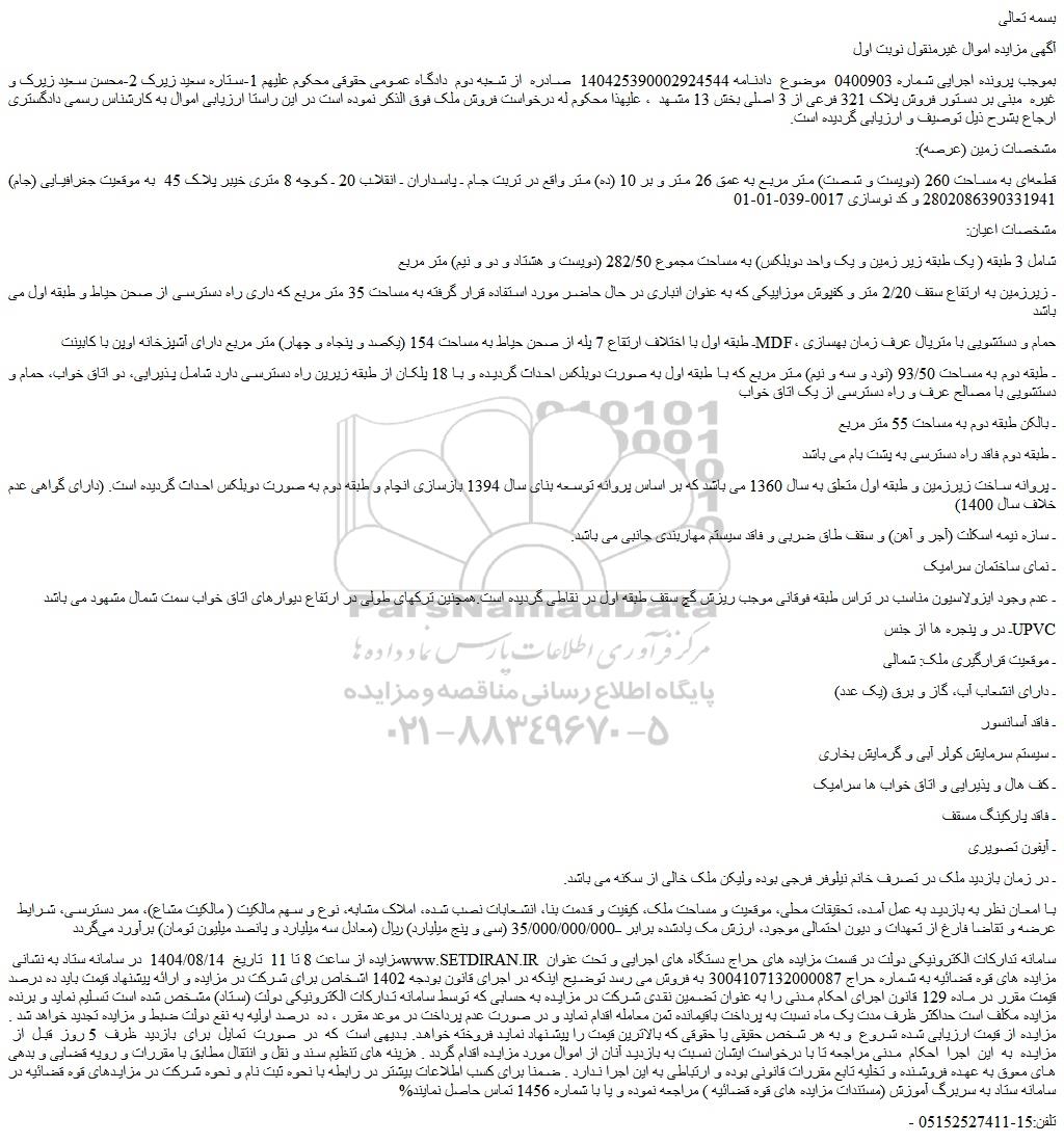 بموجب پرونده اجرایی شماره 0400903  موضوع  دادنامه 140425390002924544  صادره  از شعبه دوم  دادگاه عمومی حقوقی محکوم علیهم 1-ستاره سعید زیرک 2-محسن سعید زیرک و غیره  مبنی بر دستور فروش پلاک 321 فرعی از 3 اصلی بخش 13 مشهد  ، علیهذا محکوم له درخواست فروش ملک فوق الذکر نموده است در این راستا ارزیابی اموال به کارشناس رسمی دادگستری ارجاع بشرح ذیل توصیف و ارزیابی گردیده است.