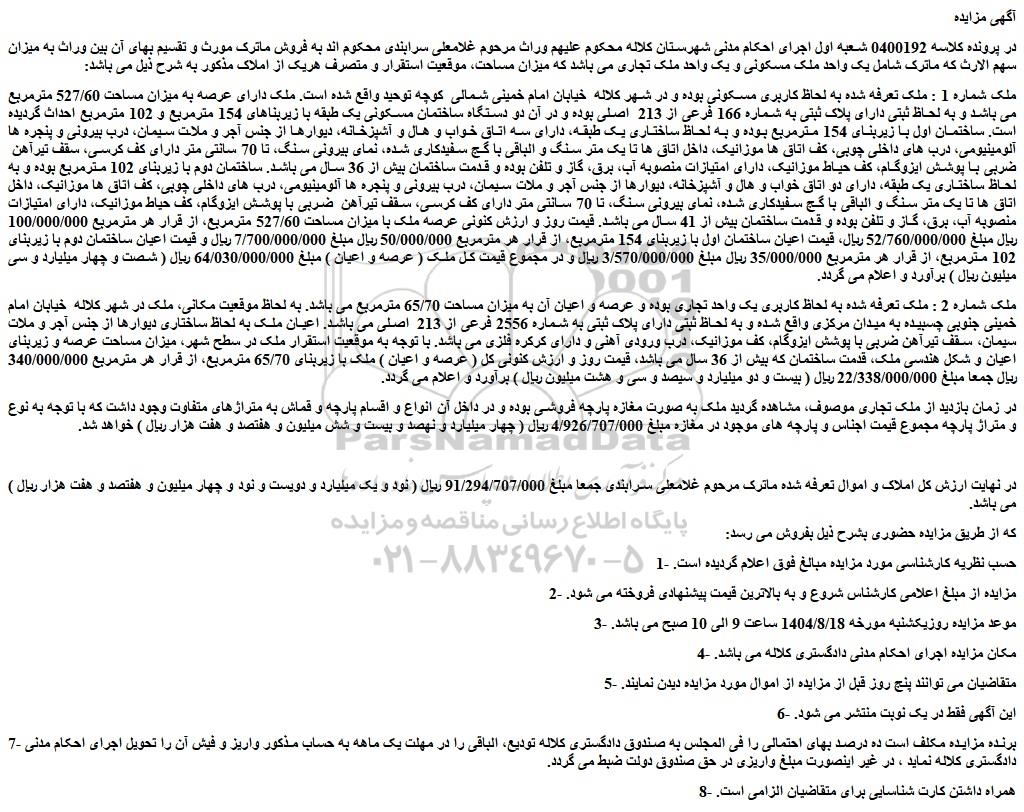 مزایده یک واحد ملک مسکونی و یک واحد ملک تجاری , مزایده یک واحد ملک مسکونی و یک واحد ملک تجاری