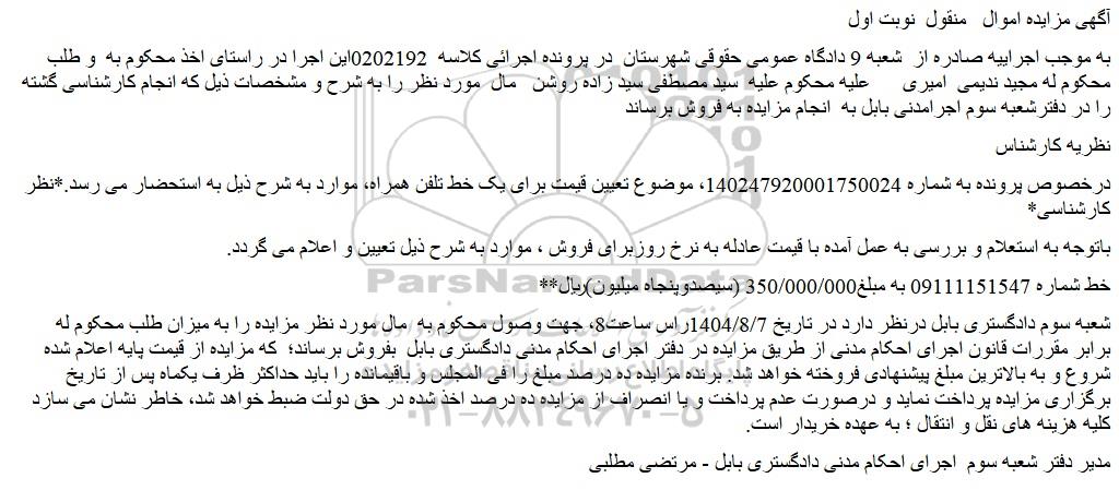 به موجب اجراییه صادره از  شعبه 9 دادگاه عمومی حقوقی شهرستان  در پرونده اجرائی کلاسه  0202192این اجرا در راستای اخذ محکوم به  و طلب محکوم له مجید ندیمی  امیری      علیه محکوم علیه  سید مصطفی سید زاده روشن   مال  مورد نظر را به شرح و مشخصات ذیل که انجام کارشناسی گشته را در دفترشعبه سوم اجرامدنی بابل به  انجام مزایده به فروش برساند