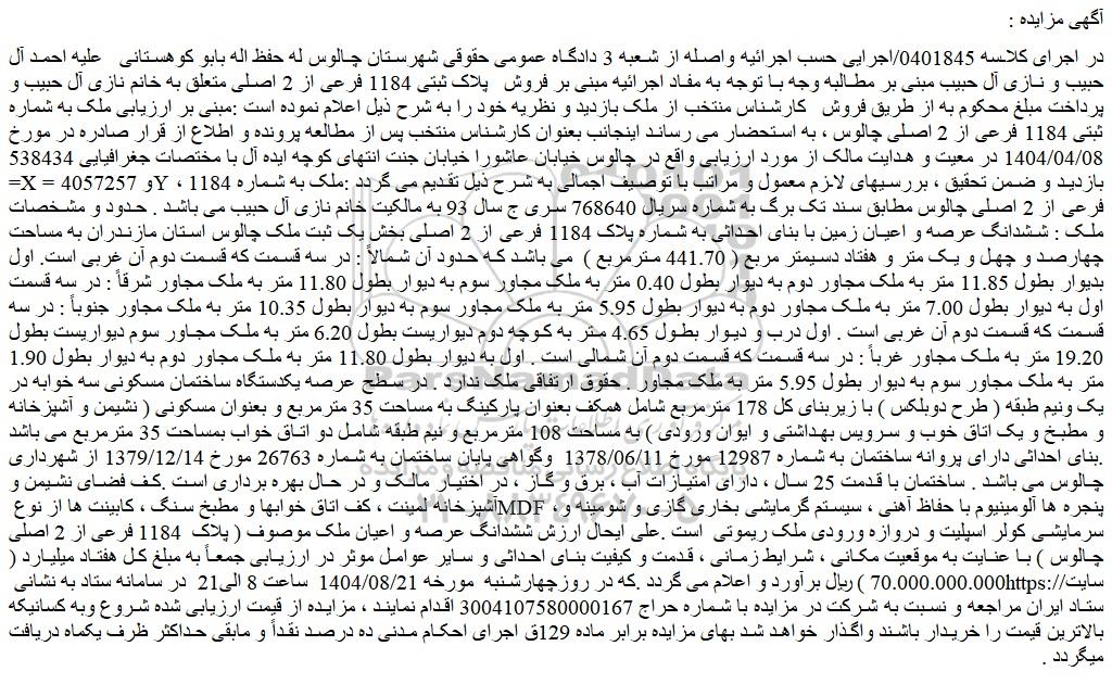 در اجرای کلاسه 0401845/اجرایی حسب اجرائیه واصله از شعبه 3 دادگاه عمومی حقوقی شهرستان چالوس له حفظ اله بابو کوهستانی علیه احمد آل حبیب و نازی آل حبیب مبنی بر مطالبه وجه با توجه به مفاد اجرائیه مبنی بر فروش پلاک ثبتی 1184 فرعی از 2 اصلی متعلق به خانم نازی آل حبیب و پرداخت مبلغ محکوم به از طریق فروش کارشناس منتخب از ملک بازدید و نظریه خود را به شرح ذیل اعلام نموده است :مبنی بر ارزیابی ملک به شماره ثبتی 1184 فرعی از 2 اصلی چالوس ، به استحضار می رساند اینجانب بعنوان کارشناس منتخب پس از مطالعه پرونده و اطلاع از قرار صادره در مورخ 1404/04/08 در معیت و هدایت مالک از مورد ارزیابی واقع در چالوس خیابان عاشورا خیابان جنت انتهای کوچه ایده آل با مختصات جغرافیایی 538434 =x و 4057257 =y ، بازدید و ضمن تحقیق ، بررسیهای لازم معمول و مراتب با توصیف اجمالی به شرح ذیل تقدیم می گردد :ملک به شماره 1184 فرعی از 2 اصلی چالوس مطابق سند تک برگ به شماره سریال 768640 سری ج سال 93 به مالکیت خانم نازی آل حبیب می باشد . حدود و مشخصات ملک : ششدانگ عرصه و اعیان زمین با بنای احداثی به شماره پلاک 1184 فرعی از 2 اصلی بخش یک ثبت ملک چالوس استان مازندران به مساحت چهارصد و چهل و یک متر و هفتاد دسیمتر مربع ( 441.70 مترمربع ) می باشد که حدود آن شمالاً : در سه قسمت که قسمت دوم آن غربی است. اول بدیوار بطول 11.85 متر به ملک مجاور دوم به دیوار بطول 0.40 متر به ملک مجاور سوم به دیوار بطول 11.80 متر به ملک مجاور شرقاً : در سه قسمت اول به دیوار بطول 7.00 متر به ملک مجاور دوم به دیوار بطول 5.95 متر به ملک مجاور سوم به دیوار بطول 10.35 متر به ملک مجاور جنوباً : در سه قسمت که قسمت دوم آن غربی است . اول درب و دیوار بطول 4.65 متر به کوچه دوم دیواریست بطول 6.20 متر به ملک مجاور سوم دیواریست بطول 19.20 متر به ملک مجاور غرباً : در سه قسمت که قسمت دوم آن شمالی است . اول به دیوار بطول 11.80 متر به ملک مجاور دوم به دیوار بطول 1.90 متر به ملک مجاور سوم به دیوار بطول 5.95 متر به ملک مجاور . حقوق ارتفاقی ملک ندارد . در سطح عرصه یکدستگاه ساختمان مسکونی سه خوابه در یک ونیم طبقه ( طرح دوبلکس ) با زیربنای کل 178 مترمربع شامل همکف بعنوان پارکینگ به مساحت 35 مترمربع و بعنوان مسکونی ( نشیمن و آشپزخانه و مطبخ و یک اتاق خوب و سرویس بهداشتی و ایوان ورودی ) به مساحت 108 مترمربع و نیم طبقه شامل دو اتاق خواب بمساحت 35 مترمربع می باشد .بنای احداثی دارای پروانه ساختمان به شماره 12987 مورخ 1378/06/11 وگواهی پایان ساختمان به شماره 26763 مورخ 1379/12/14 از شهرداری چالوس می باشد . ساختمان با قدمت 25 سال ، دارای امتیازات آب ، برق و گاز ، در اختیار مالک و در حال بهره برداری است .کف فضای نشیمن و آشپزخانه لمینت ، کف اتاق خوابها و مطبخ سنگ ، کابینت ها از نوع mdf ، پنجره ها آلومینیوم با حفاظ آهنی ، سیستم گرمایشی بخاری گازی و شومینه و سرمایشی کولر اسپلیت و دروازه ورودی ملک ریموتی است .علی ایحال ارزش ششدانگ عرصه و اعیان ملک موصوف ( پلاک 1184 فرعی از 2 اصلی چالوس ) با عنایت به موقعیت مکانی ، شرایط زمانی ، قدمت و کیفیت بنای احداثی و سایر عوامل موثر در ارزیابی جمعاً به مبلغ کل هفتاد میلیارد ( 70.000.000.000 ) ریال برآورد و اعلام می گردد .که در روزچهارشنبه مورخه 1404/08/21 ساعت 8 الی21 در سامانه ستاد به نشانی سایت ستاد ایران مراجعه و نسبت به شرکت در مزایده با شماره حراج 3004107580000167 اقدام نمایند ، مزایده از قیمت ارزیابی شده شروع وبه کسانیکه بالاترین قیمت را خریدار باشند واگذار خواهد شد بهای مزایده برابر ماده 129ق اجرای احکام مدنی ده درصد نقداً و مابقی حداکثر ظرف یکماه دریافت میگردد .