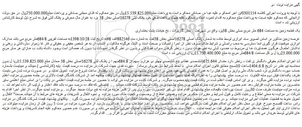 با توجه به پرونده اجرایی کلاسه 0301154این اجر امحکو م علیه عبا س صادقی محکو م است به پرداخت مبلغ15.539.825.000ریال در حق محکوم له اقای مجتبی صادقی و پرداخت مبلغ750.000.000ریال در حق دولت ازانجایی که محکوم علیه نسبت به پرداخت مبلغ محکوم به اقدام ننموده است و محکوم علیه جهت پرداخت بدهی خود پلاک ثبتی 16278اصلی بخش 38 یزد به عنوان مال معرفی و پلاک ثبتی فوق به شرح ذیل توسط کارشناس ارزیابی شد ه است