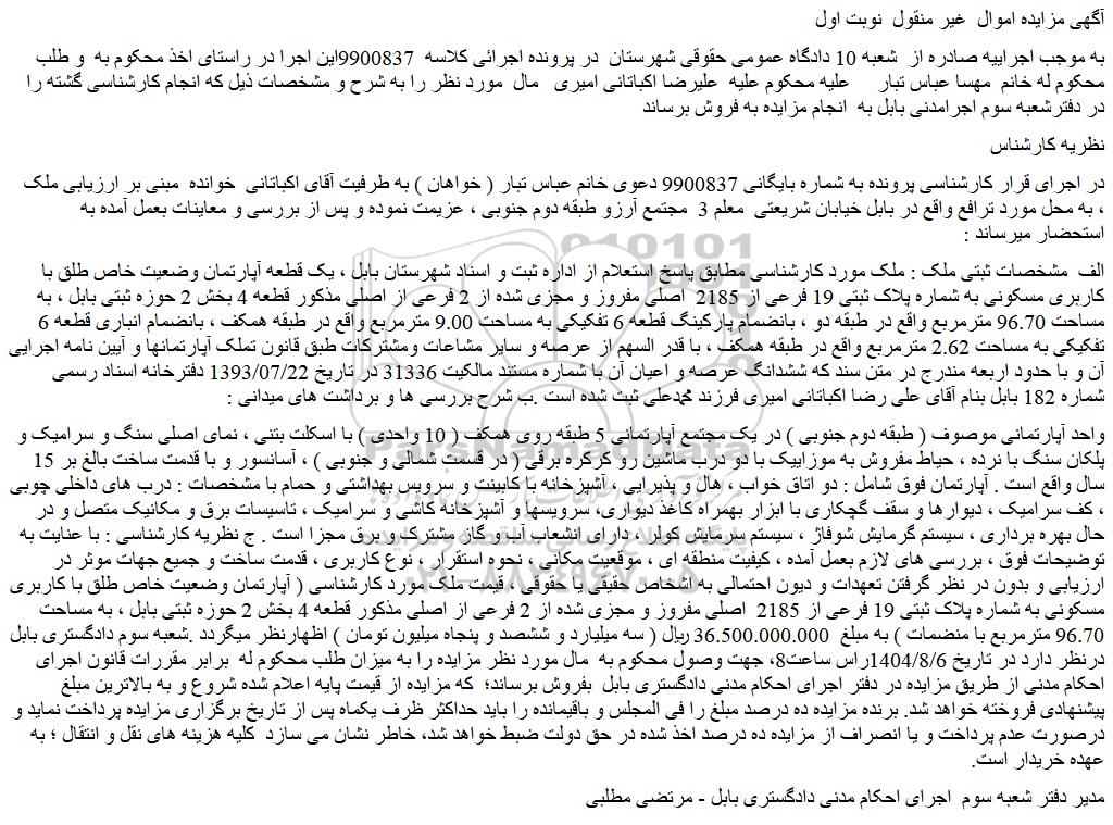 واحد آپارتمانی موصوف ( طبقه دوم جنوبی ) در یک مجتمع آپارتمانی 5 طبقه روی همکف ( 10 واحدی ) با اسکلت بتنی ، نمای اصلی سنگ و سرامیک و پلکان سنگ با نرده ، حیاط مفروش به موزاییک با دو درب ماشین رو کرکره برقی ( در قسمت شمالی و جنوبی ) ، آسانسور و با قدمت ساخت بالغ بر 15 سال واقع است . آپارتمان فوق شامل : دو اتاق خواب ، هال و پذیرایی ، آشپزخانه با کابینت و سرویس بهداشتی و حمام با مشخصات : درب های داخلی چوبی ، کف سرامیک ، دیوارها و سقف گچکاری با ابزار بهمراه کاغذ دیواری، سرویسها و آشپزخانه کاشی و سرامیک ، تاسیسات برق و مکانیک متصل و در حال بهره برداری ، سیستم گرمایش شوفاژ ، سیستم سرمایش کولر ، دارای انشعاب آب و گاز مشترک و برق مجزا است . ج نظریه کارشناسی : با عنایت به توضیحات فوق ، بررسی های لازم بعمل آمده ، کیفیت منطقه ای ، موقعیت مکانی ، نحوه استقرار ، نوع کاربری ، قدمت ساخت و جمیع جهات موثر در ارزیابی و بدون در نظر گرفتن تعهدات و دیون احتمالی به اشخاص حقیقی یا حقوقی ، قیمت ملک مورد کارشناسی ( آپارتمان وضعیت خاص طلق با کاربری مسکونی به شماره پلاک ثبتی 19 فرعی از 2185  اصلی مفروز و مجزی شده از 2 فرعی از اصلی مذکور قطعه 4 بخش 2 حوزه ثبتی بابل ، به مساحت 96.70 مترمربع با منضمات ) به مبلغ  36.500.000.000 ریال ( سه میلیارد و ششصد و پنجاه میلیون تومان ) اظهارنظر میگردد .شعبه سوم دادگستری بابل درنظر دارد در تاریخ 1404/8/6راس ساعت8، جهت وصول محکوم به  مال مورد نظر مزایده را به میزان طلب محکوم له  برابر مقررات قانون اجرای احکام مدنی از طریق مزایده در دفتر اجرای احکام مدنی دادگستری بابل  بفروش برساند؛  که مزایده از قیمت پایه اعلام شده شروع و به بالاترین مبلغ پیشنهادی فروخته خواهد شد. برنده مزایده ده درصد مبلغ را فی المجلس و باقیمانده را باید حداکثر ظرف یکماه پس از تاریخ برگزاری مزایده پرداخت نماید و درصورت عدم پرداخت و یا انصراف از مزایده ده درصد اخذ شده در حق دولت ضبط خواهد شد، خاطر نشان می سازد  کلیه هزینه های نقل و انتقال ؛ به عهده خریدار است.