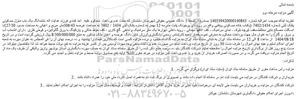 نظربه اینکه بموجب اجرائیه شماره 140339420000140843 صادره از شعبه 5 دادگاه عمومی حقوقی شهرستان دشتستان که بعلت عدم پرداخت محکوم علیه: احد قبادی فرزند هدایت اله ،ششدانگ یک باب منزل مسکونی پلاک ثبتی شماره 7402/1434 (یکباب خانه مسکونی ویلایی واقع در روستای پرجونک پشت مدرسه 12 بهمن به شماره پلاک ثبتی 1434 / 7402 به مساحت عرصه 506/43متر مربع و اعیانی به مساحت حدود 127/30با اسکلت مصالح بنایی مختلط،سقف تیرچه بلوک ، نمای سرامیک ، کف اتاقها سیمانی ، رویه داخلی دیوارها یک متر سرامیک و مابقی گچ کاری ، کف حیاط خاکی و پارکینگ با ورق گالوانیزه و قوطی فلزی دارای انشعاب آب و بـرق و گاز) را به عنوان مال جهت پرداخت محکوم به معرفی نموده که از ناحیه کارشناس رسمی دادگستری ارزش شش دانگ عرصه و اعیان ملک مذکور به مبلغ 8/500/000/000 ریال ارزیابی گردیده است و در تاریخ 1404/08/18 از ساعت 8 الی 12 در سامانه ستاد ایران به نشانی سایت ستاد ایران به مزایده گذاشته میشود و برنده مزایده کسی است که بالاترین قیمت را پیشنهاد و ده درصد بهای آن را فی المجلس به عنوان سپرده به شعبه اجرای احکام تسلیم و بقیه بهای اموال را ظرف مدت 30 روز از تاریخ مزایده پرداخت نماید در صورت عدم پرداخت مابقی وجه سپرده تودیعی پس از کسر هزینه مزایده به نفع دولت ضبط خواهد شد لذا متقاضیان میتوانند در مدت پنج روز قبل از برگذاری تاریخ مزایده اموال را ملاحظه نمایند شرکت کنندگان باید ده درصد مبلغ ذکر شده را از طریق سامانه ستاد ایران به حساب سپرده دادگستری استان بوشهر واریز والباقی آن ظرف یک ماه از تاریخ انجام مزایده دریافت می گردد و در صورت انصراف خریدار از خرید و یا عدم پرداخت ثمن مزایده در موعد مقرر 10% اولیه بنفع صندوق دولت ضبط و مزایده باطل و تجدید می گردد.