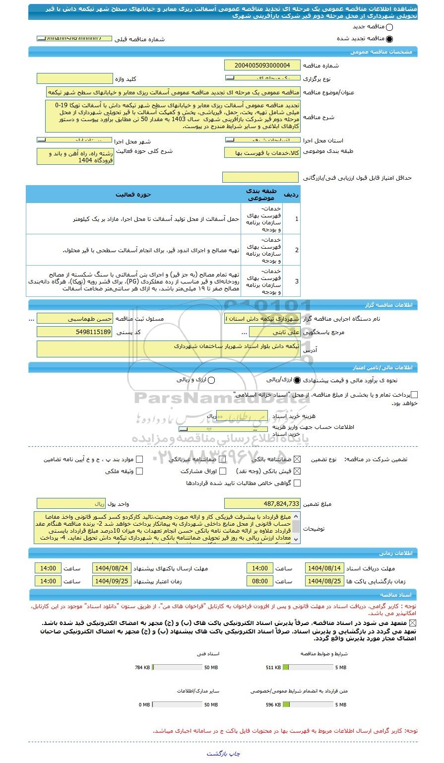 شرح مناقصهتجدید مناقصه عمومی آسفالت ریزی معابر و خیابانهای سطح شهر تیکمه داش با آسفالت توپکا 19-0 میلی شامل تهیه، پخت، حمل، قیرپاشی، پخش و کمپکت آسفالت با قیر تحویلی شهرداری از محل مرحله دوم قیر شرکت بازآفرینی شهری سال 1403 به مقدار 50 تن مطابق برآورد پیوست و دستور کارهای ابلاغی و سایر شرایط مندرج در پیوست.