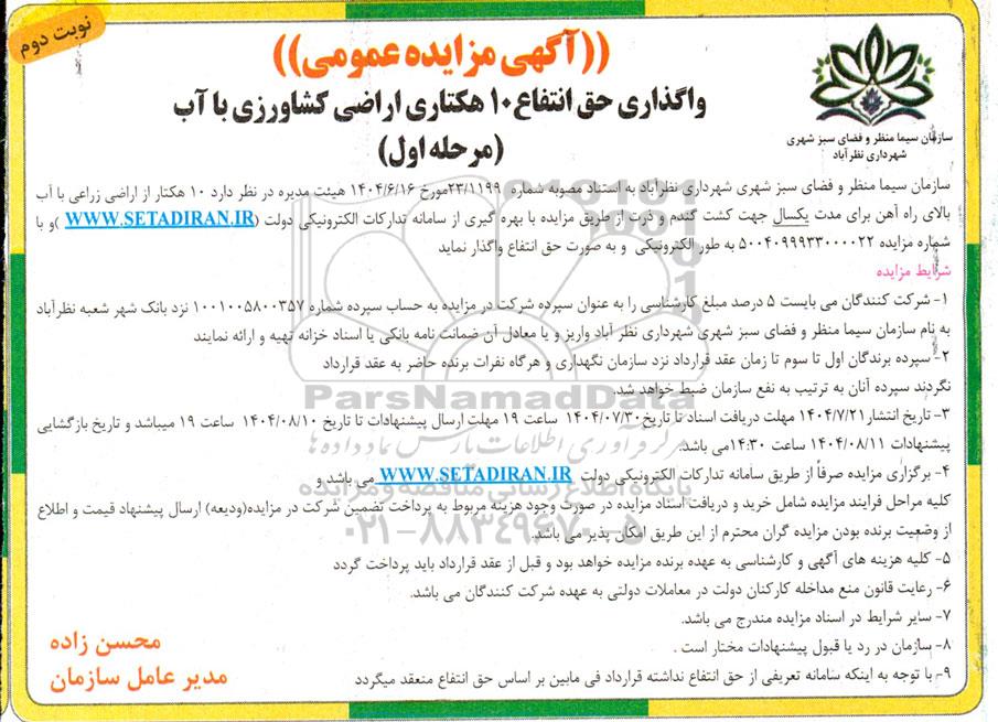سازمان سیما منظر و فضای سبز شهری شهرداری نظرآباد به استناد مصوبه شماره 1199/23 مورخ 1404.6.16 هیئت مدیره در نظر دارد 10 هکتار از اراضی زراعی با آب بالای راه آهن برای مدت یک سال جهت کشت گندم و ذرت از طریق مزایده یا بهره گیری از سامانه تدارکات الکترونیکی دولت ستاد ایران و با شماره مزایده 5004099933000022 به طور الکترونیکی به صورت حق انتفاع واگذار نماید