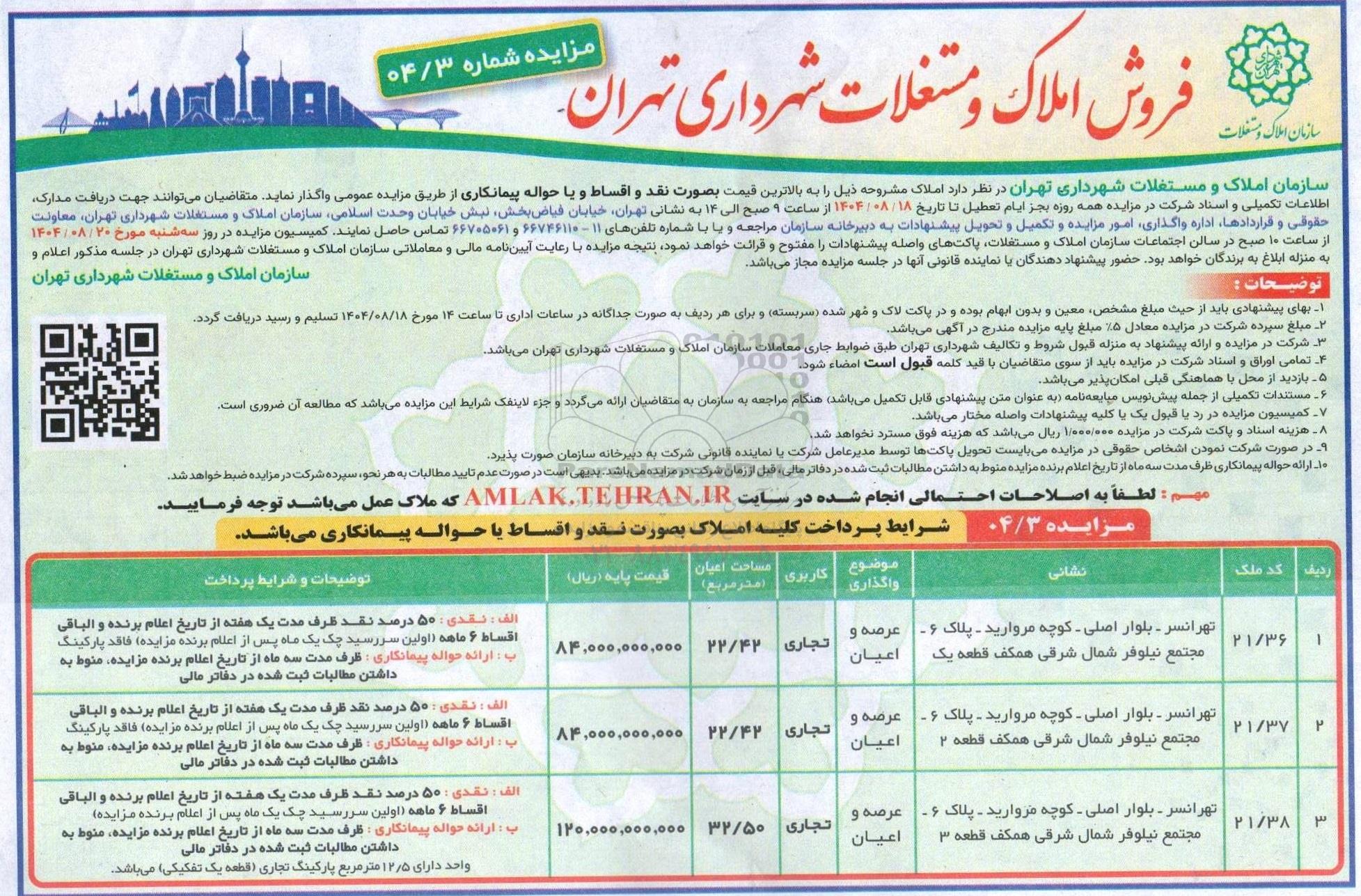 سازمان املاک و مستغلات شهرداری تهران در نظر دارد املاک مشروحه ذیل را به بالاترین قیمت بصورت نقد و اقساط و یا حواله پیمانکاری از طریق مزایده عمومی واگذار نماید. متقاضیان میتوانند جهت دریافت مدارک، اطلاعات تکمیلی و اسناد شرکت در مزایده همه روزه بجز ایام تعطیل تا تاریخ 1404.08.18 از ساعت 9 صبح الی 14 به نشانی تهران -خیابان فیاض بخش -نبش خیابان وحدت اسلامی - سازمان املاک و مستغلات شهرداری تهران معاونت حقوقی، واحد مزایده و تکمیل و تحویل پیشنهادات به دبیرخانه سازمان مراجعه و یا با شماره تلفنهای 11 - 66746110  و 66705061  تماس حاصل نمایند. کمیسیون مزایده در روز سه شنبه مورخ 1404.08.20 از ساعت 10 صبح در سالن اجتماعات سازمان املاک و مستغلات پاکتهای واصله پیشنهادات را مفتوح و قرائت خواهد نمود، نتیجه مزایده با رعایت آیین نامه مالی و معاملاتی سازمان املاک و مستغلات شهرداری تهران در جلسه مذکور اعلام و به منزله ابلاغ به برندگان خواهد بود. حضور پیشنهاد دهندگان با نماینده قانونی آنها در جلسه مزایده مجاز می باشد.