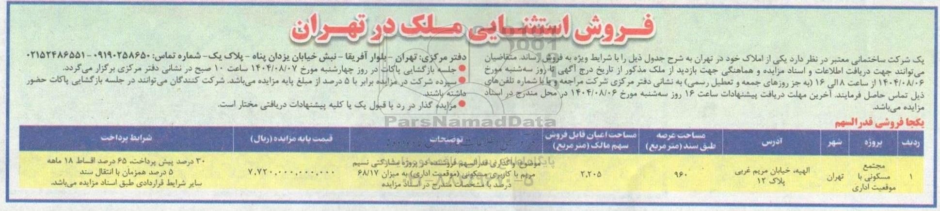 | 1 | مجتمع مسکونی با موقعیت اداری | تهران | الهیه، خیابان مریم غربی پلاک 12 | 960 | 2.205 | موضوع: واگذاری قدرالسهم فروشنده در پروژه مشارکتی نسیم مریم با کاربری مسکونی (موقعیت اداری) به میزان 68.17 درصد با مشخصات مندرج در اسناد مزایده | 7.720.000.000.000 | 30 درصد پیش پرداخت، 65 درصد اقساط 18 ماهه 5 درصد همزمان با انتقال سند سایر شرایط قراردادی طبق اسناد مزایده می باشد |