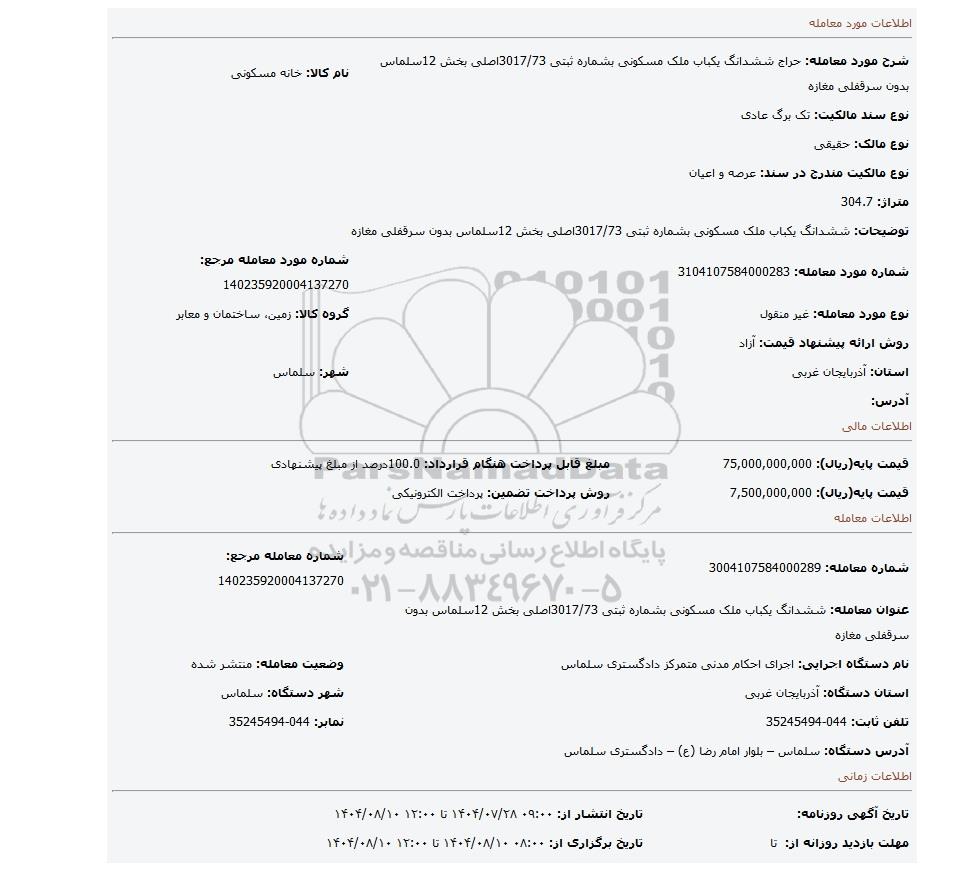 عنوان معامله: ششدانگ یکباب ملک مسکونی بشماره ثبتی 3017/73اصلی بخش 12سلماس بدون سرقفلی مغازه