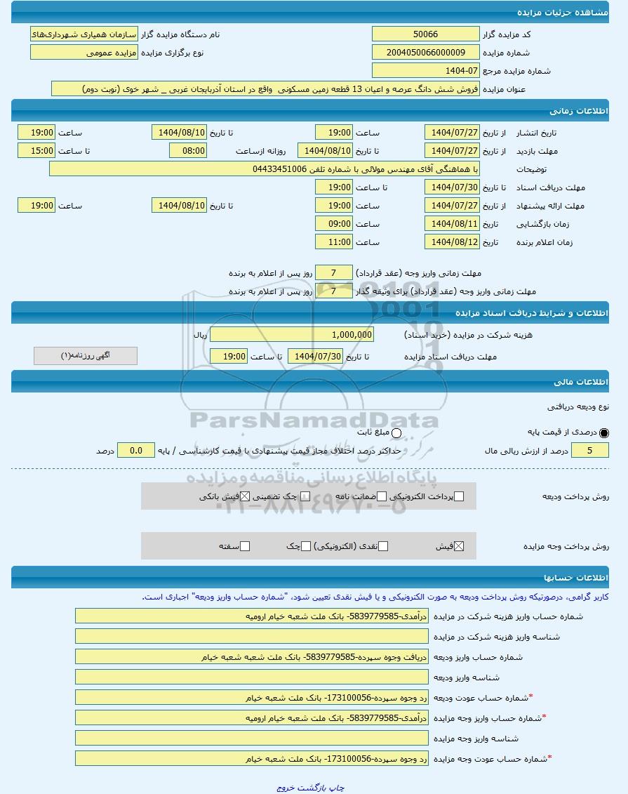| شماره حساب واریز وجه مزایده | درآمدی-5839779585- بانک ملت شعبه خیام ارومیه |