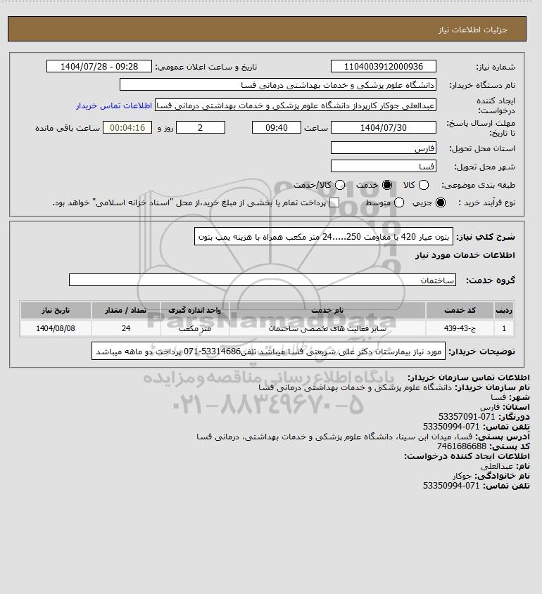 شرح کلی نیاز: بتون عیار 420 با مقاومت 250.....24 متر مکعب همراه با هزینه پمپ بتون