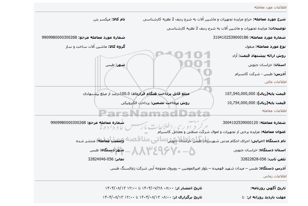 نام دستگاه اجرایی: اجرای احکام مدنی شهرستان طبس خراسان جنوبیوضعیت معامله: منتشر شده