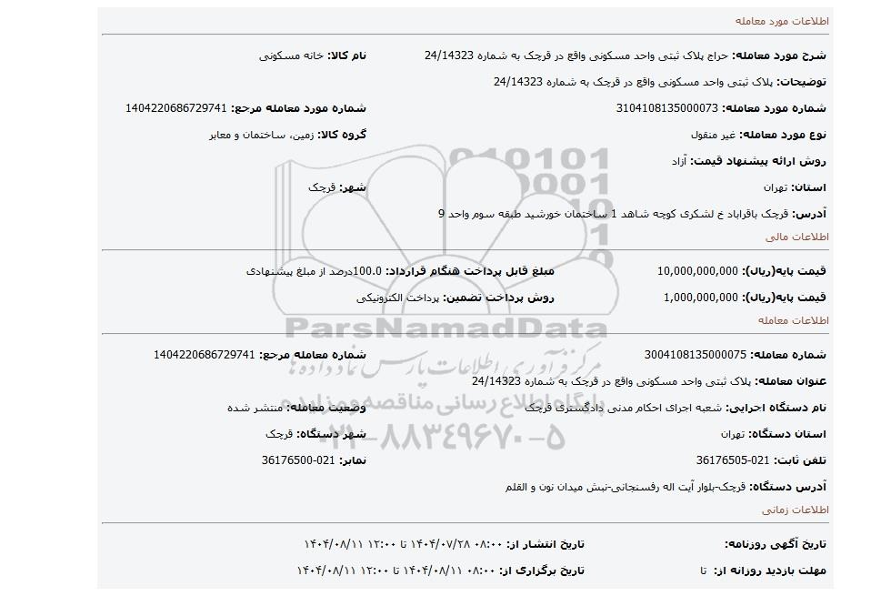 عنوان معامله: پلاک ثبتی واحد مسکونی واقع در قرچک به شماره 24/14323