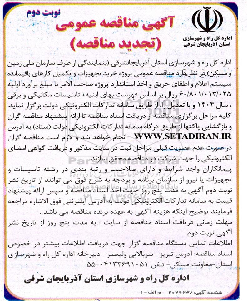 اداره کل راه و شهرسازی استان آذربایجان شرقی (بنمایندگی از طرف سازمان ملی زمین و مسکن) در نظر دارد مناقصه عمومی پروژه خرید تجهیزات و تکمیل کارهای باقیمانده سیستم اعلام و اطفای حریق و اخذ استاندارد پروژه صاحب الامر با مبلغ برآورد اولیه 60.801.013.025 ریال بر اساس فهرست بهای ابنیه + تاسیسات مکانیکی و برقی، سال 1404 و با تعدیل را، از طریق سامانه تدارکات الکترونیکی دولت برگزار نماید. کلیه مراحل برگزاری مناقصه از دریافت اسناد مناقصه تا ارائه پیشنهاد مناقصه گران و بازگشایی پاکتها از طریق درگاه سامانه تدارکات الکترونیکی دولت (ستاد) به آدرس ستاد ایران انجام خواهد شد و لازم است مناقصه گران در صورت عدم عضویت قبلی مراحل ثبت در سایت مذکور و دریافت گواهی امضای الکترونیکی را جهت شرکت در مناقصه محقق سازند .