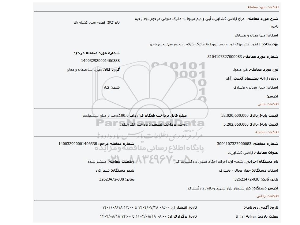 | شرح مورد معامله: حراج اراضی کشاورزی آبی و دیم مربوط به ماترک متوفی مرحوم محمد رحیم باحور | نام کالا: قطعه زمین کشاورزی | |