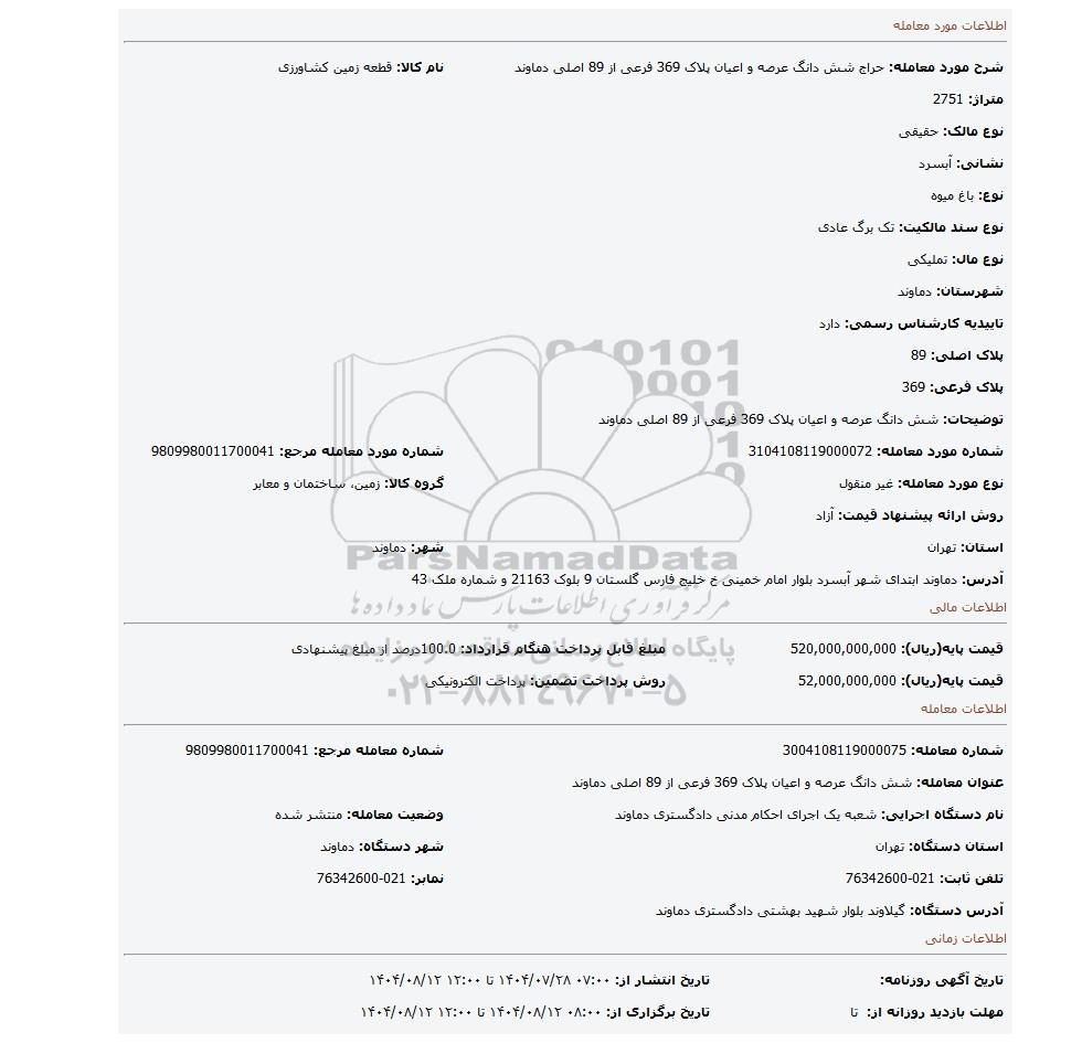 مزایده، شش دانگ عرصه و اعیان پلاک 369 فرعی از 89 اصلی دماوند