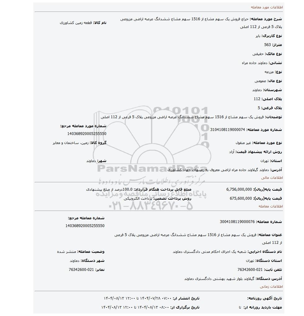 | شرح مورد معامله: حراج فروش یک سهم مشاع از 1516 سهم مشاع ششدانگ عرصه اراضی مزروعی پلاک 5 فرعی از 112 اصلی | نام کالا: قطعه زمین کشاورزی | |