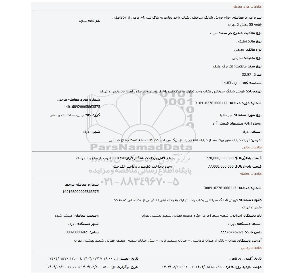 | شرح مورد معامله: حراج فروش 6دانگ سرقفلی یکباب واحد تجاری به پلاک ثبتی74 فرعی از 367اصلی قطعه 55 بخش 2 تهران | نام کالا: مغازه | |