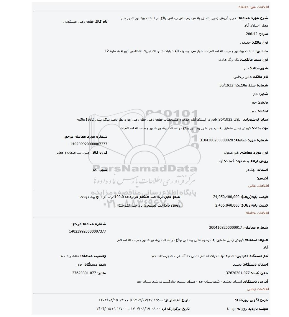 مزایده، فروش زمین متعلق به مرحوم علی ریحانی واقع در استان بوشهر شهر جم محله اسلام آباد