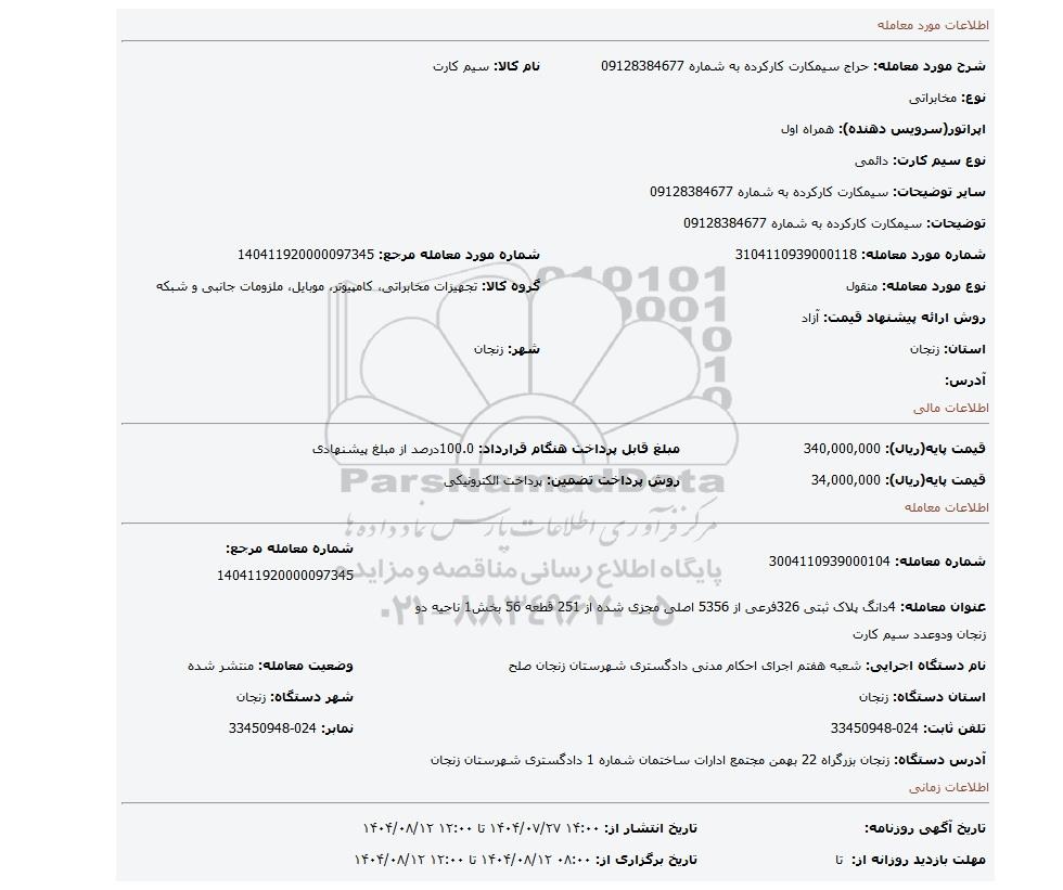 | عنوان معامله: 4دانگ پلاک ثبتی 326فرعی از 5356 اصلی مجزی شده از 251 قطعه 56 بخش1 ناحیه دو زنجان ودوعدد سیم کارت | ||