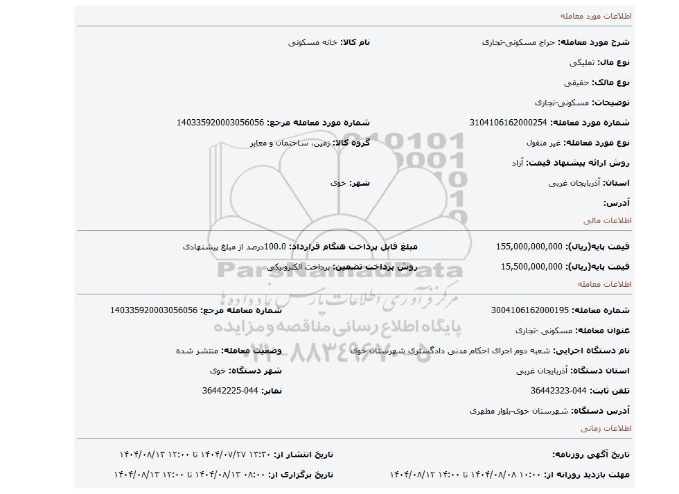 | نام دستگاه اجرایی: شعبه دوم اجرای احکام مدنی دادگستری شهرستان خوی | وضعیت معامله: منتشر شده | |