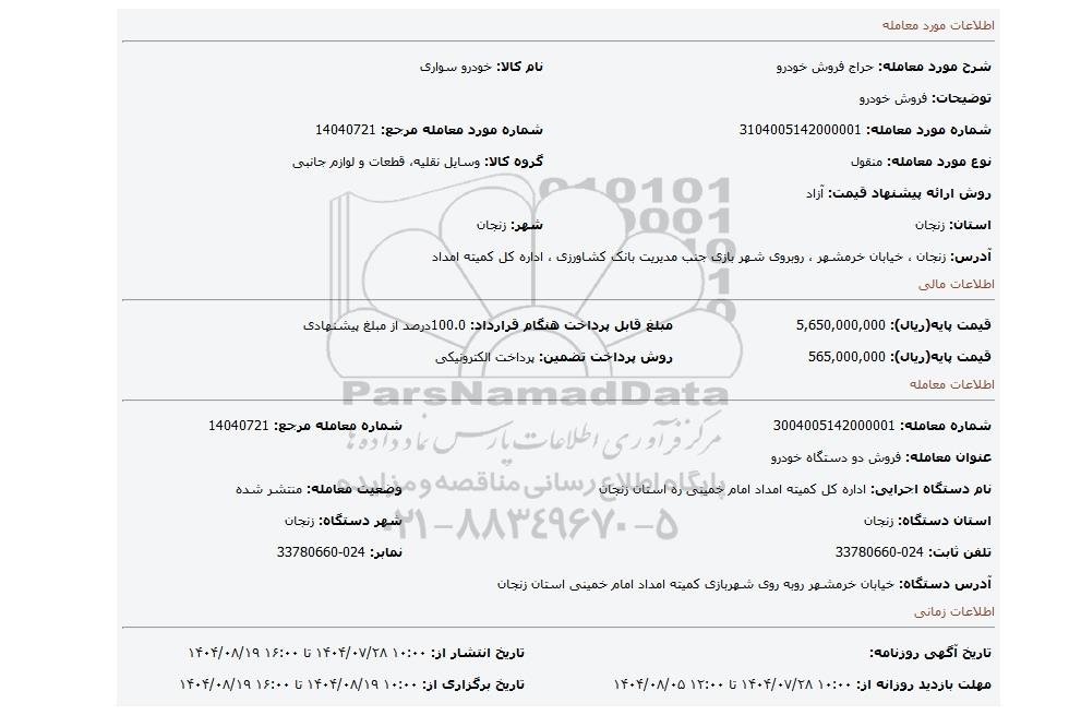 | عنوان معامله: فروش دو دستگاه خودرو | ||