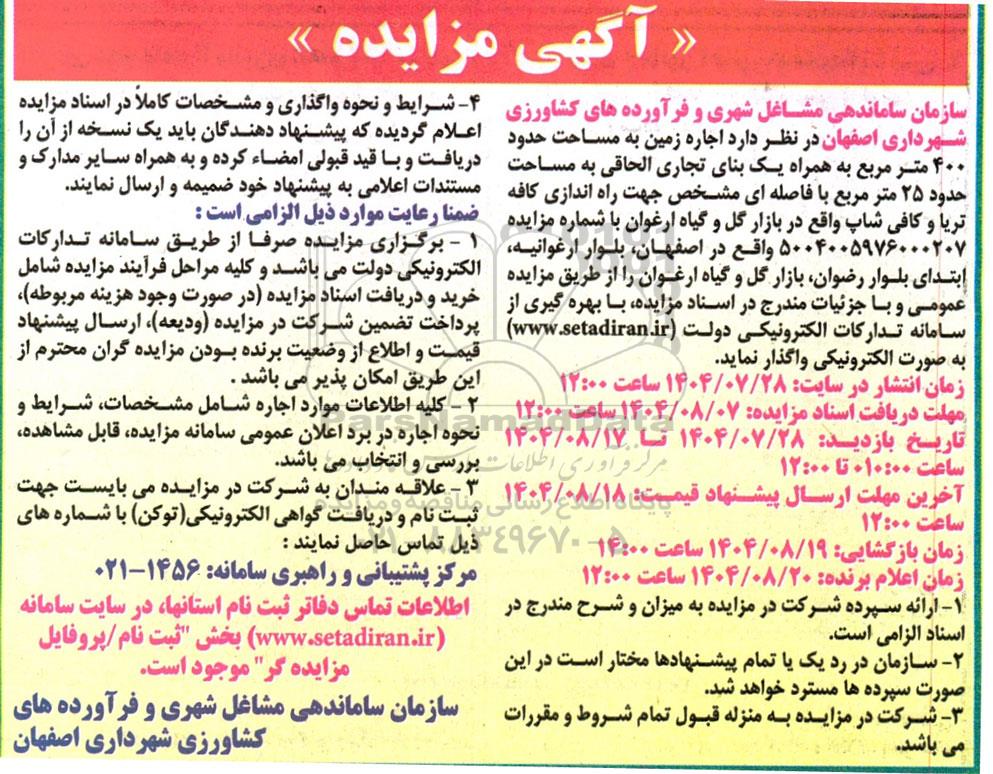 سازمان ساماندهی مشاغل شهری و فرآورده های کشاورزی شهرداری اصفهان در نظر دارد اجاره زمین به مساحت حدود 400 مترمربع به همراه یک بنای تجاری الحاقی به مساحت حدود 25 مترمربع با فاصله ای مشخص جهت راه اندازی کافه تریا و کافی شاپ واقع در بازار گل و گیاه ارغوان با شماره مزایده 5004005976000207 واقع در اصفهان، بلوار ارغوانیه، ابتدای بلوار رضوان، بازار گل و گیاه ارغوان را از طریق مزایده عمومی و با جزئیات مندرج در اسناد مزایده با بهره گیری از سامانه تدارکات الکترونیکی دولت ستاد ایران به صورت الکترونیکی واگذار نماید.