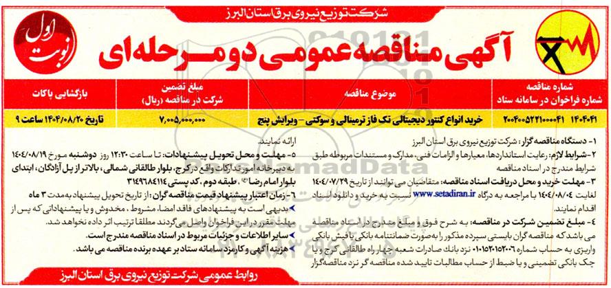 | 2004005221000041 1404041 | خرید انواع کنتور دیجیتالی تک فاز ترمینالی و سوکتی - ویرایش پنج | 7.005.000.000 | تاریخ 1404.08.20 ساعت 9 |