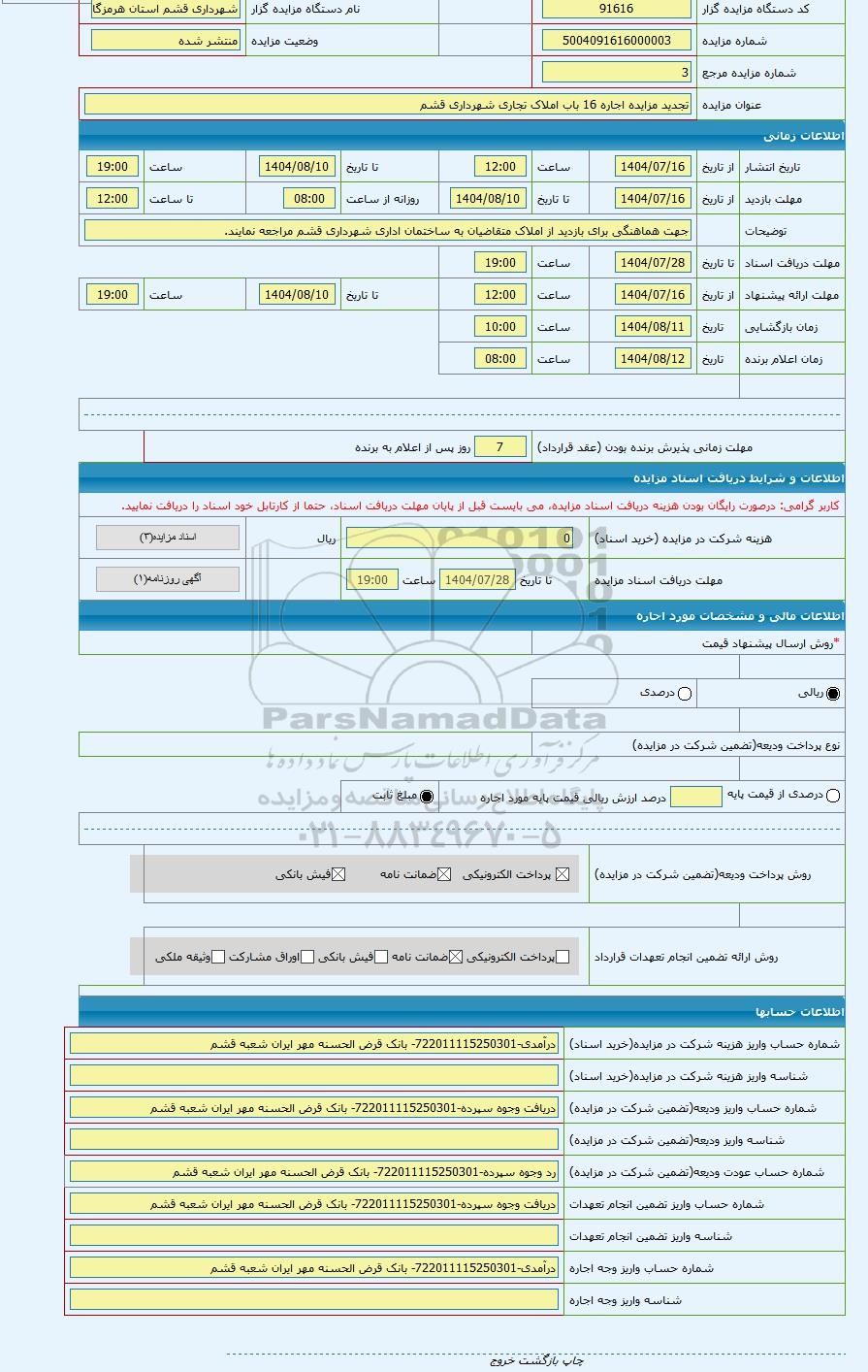 | عنوان مزایده | تجدید مزایده اجاره 16 باب املاک تجاری شهرداری قشم | |||