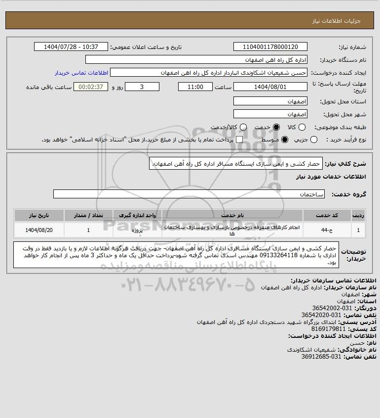 شرح کلی نیاز: حصار کشی و ایمن سازی ایستگاه مسافر اداره کل راه آهن اصفهان.