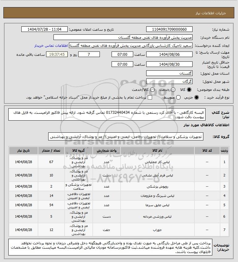 شرح کلی نیاز: البسه کارگاهی - با آقای کرد رستمی با شماره 01732440434 تماس گرفته شود. ارائه پیش فاکتور الزامیست. به فایل های پیوست دقت شود.
