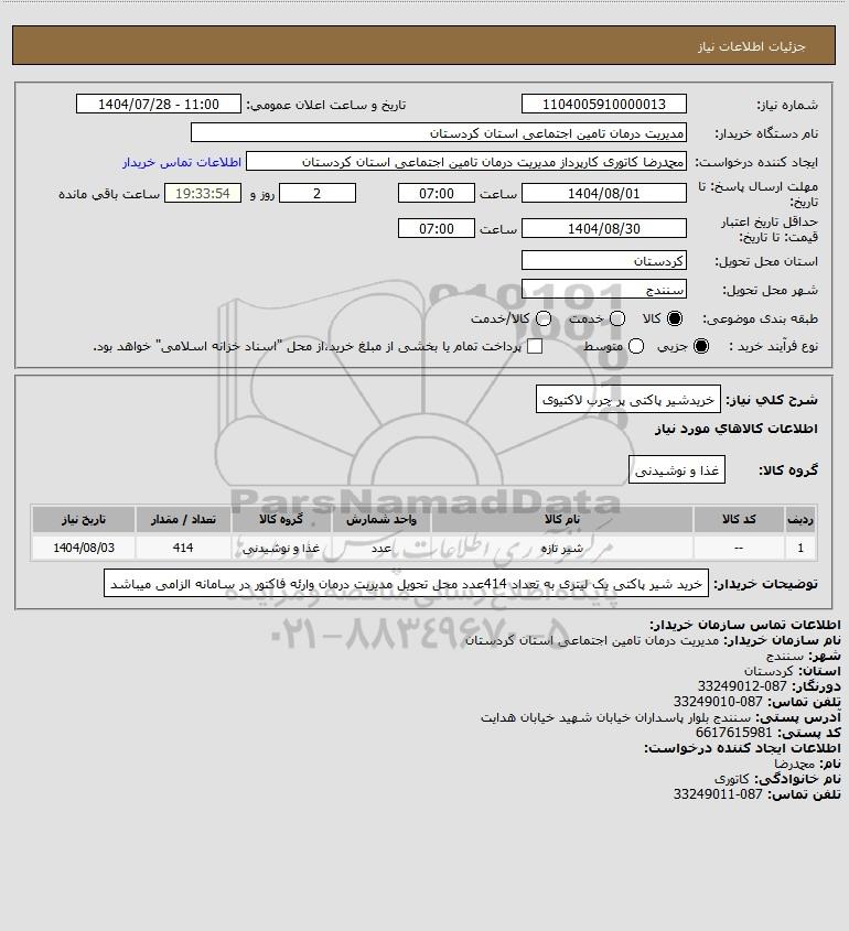 شرح کلی نیاز: خریدشیر پاکتی پر چرب لاکتیوی