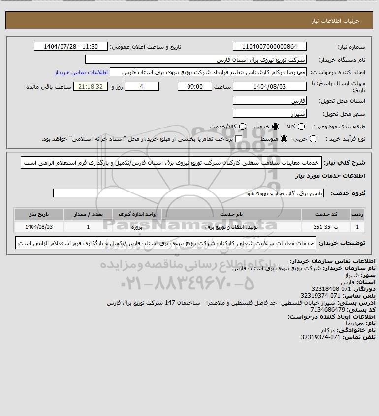 شرح کلی نیاز: خدمات معاینات سلامت شغلی کارکنان شرکت توزیع نیروی برق استان فارس/تکمیل و بارگذاری فرم استعلام الزامی است