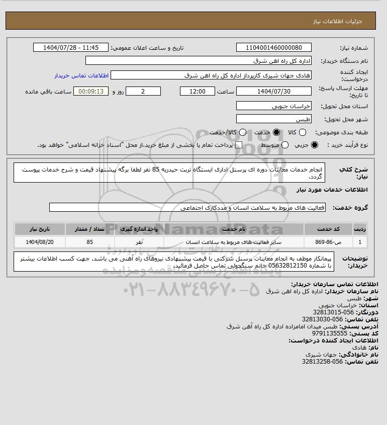 شرح کلی نیاز: انجام خدمات معاینات دوره ای پرسنل اداری ایستگاه تربت حیدریه 85 نفر لطفا برگه پیشنهاد قیمت و شرح خدمات پیوست گردد.
