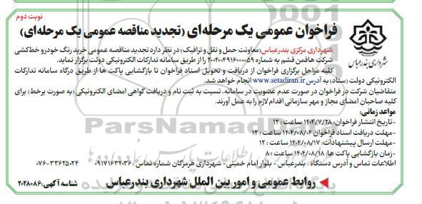 شهرداری بندرعباس (معاونت حمل و نقل و ترافیک ) در نظر دارد تجدید مناقصه عمومی خرید رنگ خودرو خط کشی شرکت هافمن قشم به شماره 2004004916000059 را از طریق سامانه تدارکات الکترونیکی دولت برگزار نماید.