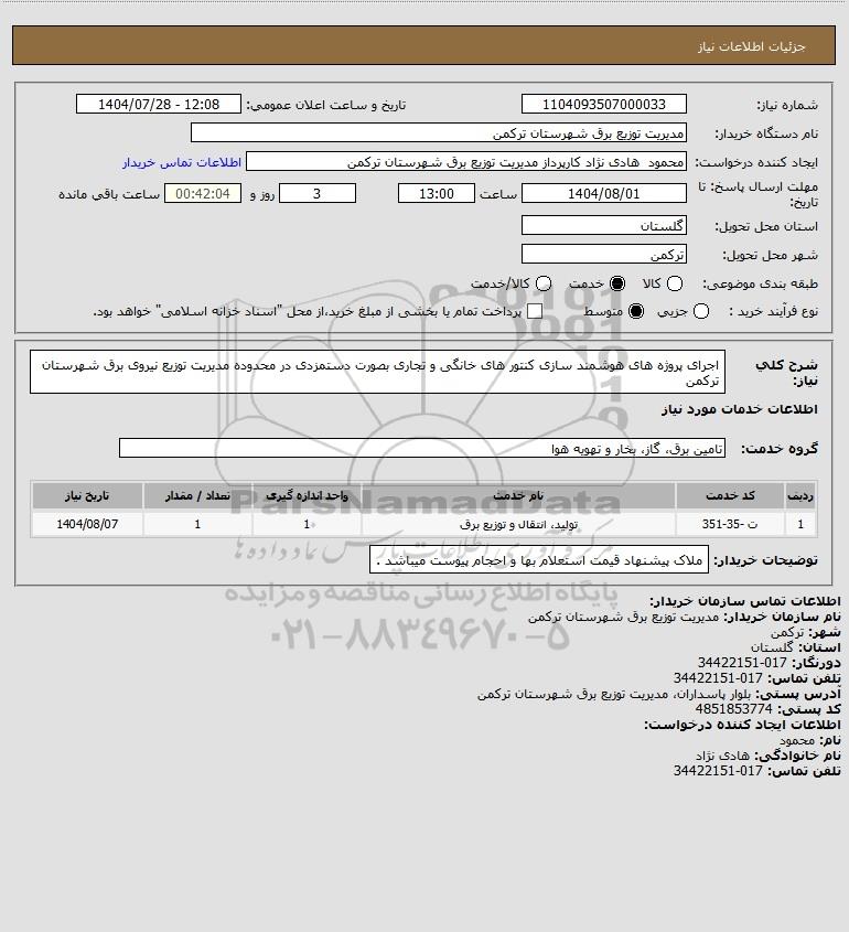 شرح کلی نیاز: اجرای پروژه های هوشمند سازی کنتور های خانگی و تجاری بصورت دستمزدی در محدوده مدیریت توزیع نیروی برق شهرستان ترکمن
