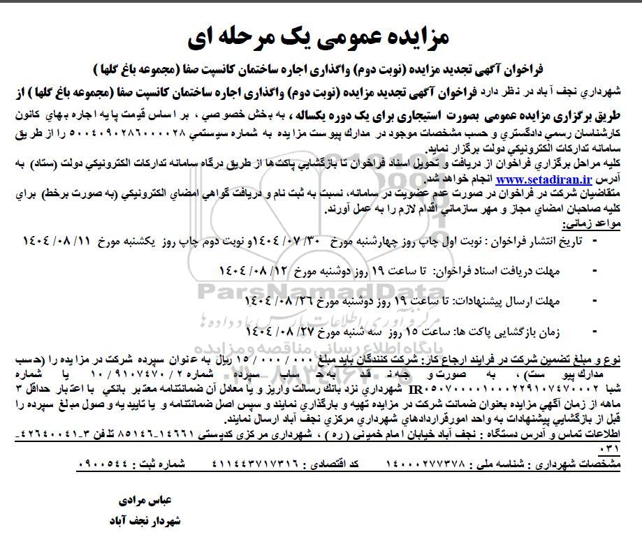 شهرداری نجف آباد در نظر دارد فراخوان آگهی تجدید مزایده (نوبت دوم) واگذاری اجاره ساختمان کانسپت صفا (مجموعه باغ گلها ) از طریق برگزاری مزایده عمومی بصورت استیجاری برای یک دوره یکساله ، به بخش خصوصی ، بر اساس قیمت پایه اجاره بهای کانون کارشناسان رسمی دادگستری و حسب مشخصات موجود در مدارک پیوست مزایده به شماره سیستمی 5004090286000028 را از طریق سامانه تداركات الكترونیكی دولت برگزار نماید.
