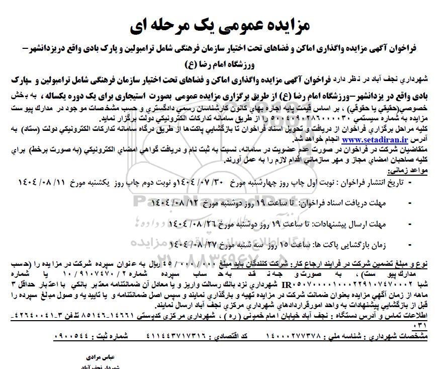 شهرداری نجف آباد در نظر دارد فراخوان آگهی مزایده واگذاری اماکن و فضاهای تحت اختیار سازمان فرهنگی شامل تارمبولین و پارک بادی واقع در یزدانشهر- ورزشگاه امام رضا (ع) از طریق برگزاری مزایده عمومی بصورت استیجاری برای یک دوره یکساله ، به بخش خصوصی ، بر اساس قیمت پایه اجاره بهای کانون کارشناسان رسمی دادگستری و حسب مشخصات موجود در مدارک پیوست مزایده به شماره سیستمی 5004090286000030 را از طریق سامانه تداركات الكترونیكی دولت برگزار نماید.