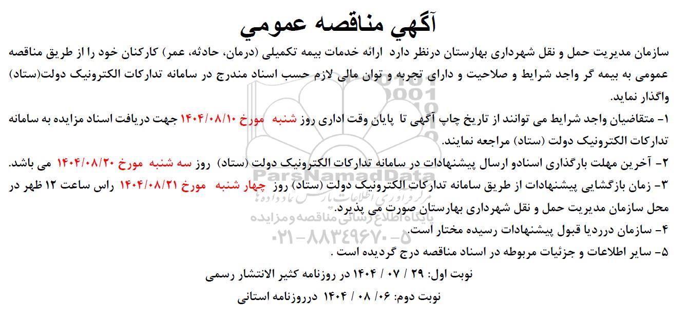 سازمان مدیریت حمل و نقل شهرداری بهارستان در نظر دارد ارائه خدمات بیمه تکمیلی (درمان ، حادثه ، عمر) کارکنان خود را از طریق مناقصه عمومی به بیمه گر واجد شرایط و صلاحیت و دارای تجربه و توان مالی لازم حسب اسناد مندرج در سامانه تدارکات الکترونیک دولت (ستاد) واگذار نماید.