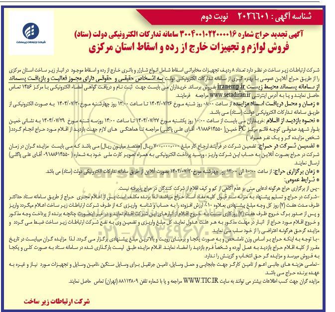 فروش لوازم و تجهیزات خارج از رده و اسقاط استان مرکزی