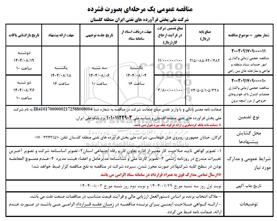 این مناقصه در استان گلستان با دسته بندی های صنفی و تخصصی تامین نیروی انسانی, پیمانکاری نفت و گاز و پتروشیمی, تجهیزات و احداث جایگاه سوخت برگزار میشود.