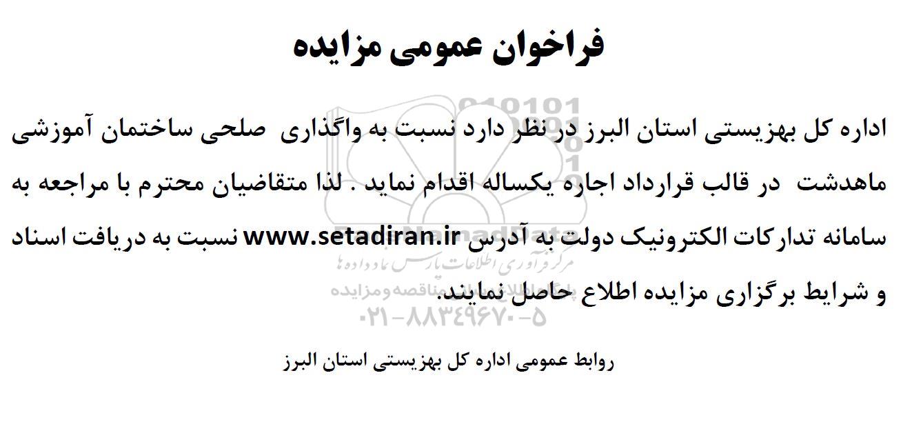اداره کل بهزیستی استان البرز در نظر دارد نسبت به واگذاری صلحی ساختمان آموزشی ماهدشت در قالب قرارداد اجاره یکساله اقدام نماید . لذا متقاضیان محترم با مراجعه به سامانه تدارکات الکترونیک دولت نسبت به دریافت اسنادو شرایط برگزاری مزایده اطلاع حاصل نمایند.