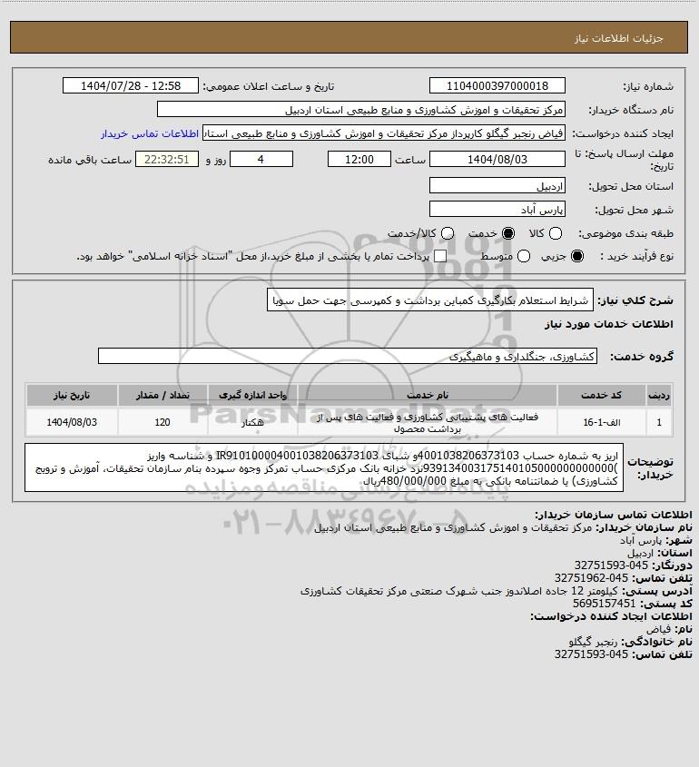 توضیحات خریدار:اریز به شماره حساب 4001038206373103و شبای IR910100004001038206373103 و شناسه واریز )939134003175140105000000000000نزد خزانه بانک مرکزی حساب تمرکز وجوه سپرده بنام سازمان تحقیقات، آموزش و ترویج کشاورزی) یا ضمانتنامه بانکی به مبلغ 480/000/000ریال