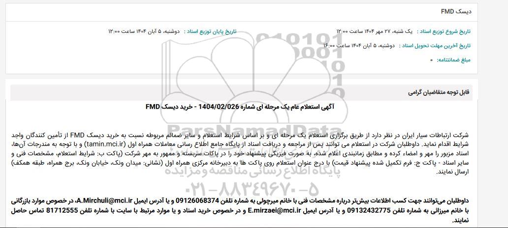 شرکت ارتباطات سیار ایران در نظر دارد از طریق برگزاری استعلام یک مرحله ای و بر اساس شرایط استعلام و سایر ضمائم مربوطه نسبت به خرید دیسک FMD از تأمین کنندگان واجد شرایط اقدام نماید. داوطلبان شرکت در استعلام می توانند پس از مراجعه و دریافت اسناد از پایگاه جامع اطلاع رسانی معاملات همراه اول (tamin.mci.ir) و با توجه به مندرجات آنها، اسناد مزبور را مهر و امضاء کرده و مطابق زمانبندی اعلام شده، به صورت فیزیکی پیشنهاد خود را در پاکات سربسته و ممهور به مهر شرکت (پاکت ب: شرایط استعلام، مشخصات فنی و سایر اسناد - پاکت ج: فرم تکمیل شده پیشنهاد قیمت) با درج عنوان استعلام روی پاکت ها به دبیرخانه مرکزی همراه اول (نشانی: میدان ونک، خیابان ونک، برج همراه، طبقه همکف) ارسال نمایند.
