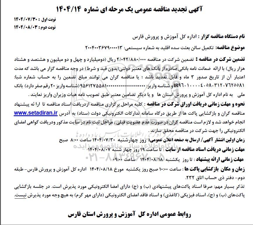 آگهی تجدید مناقصه عمومی یک مرحله ای شماره 1404/14